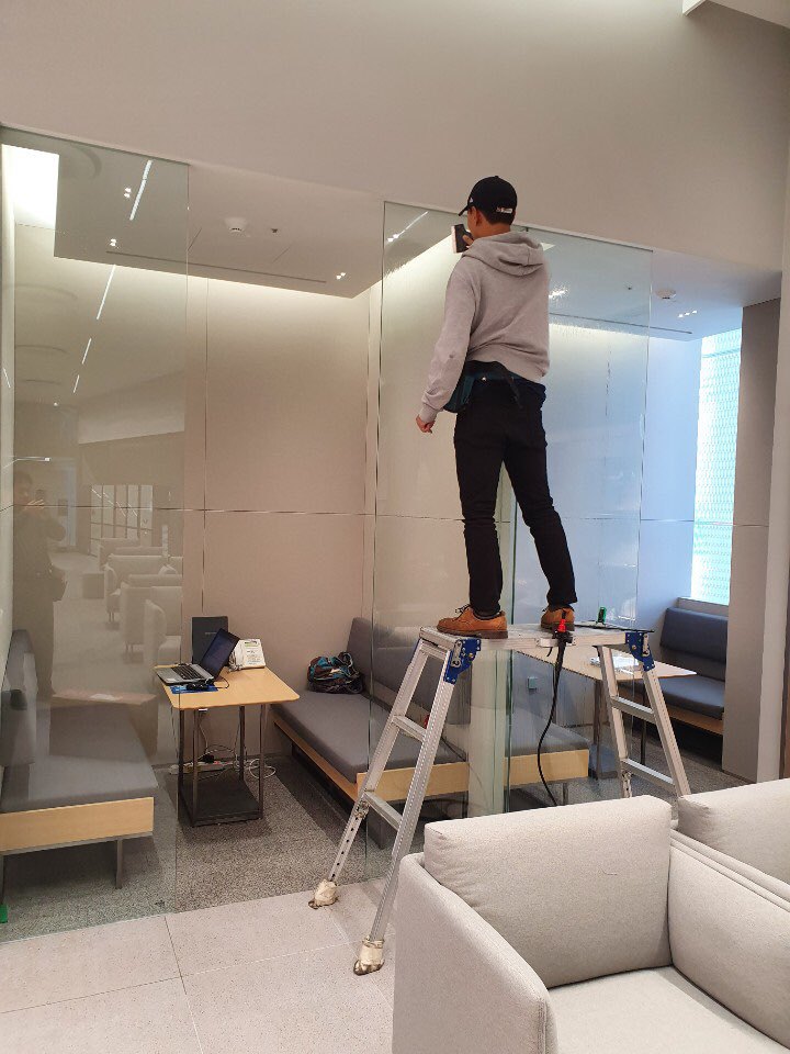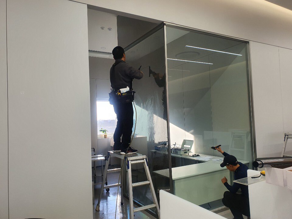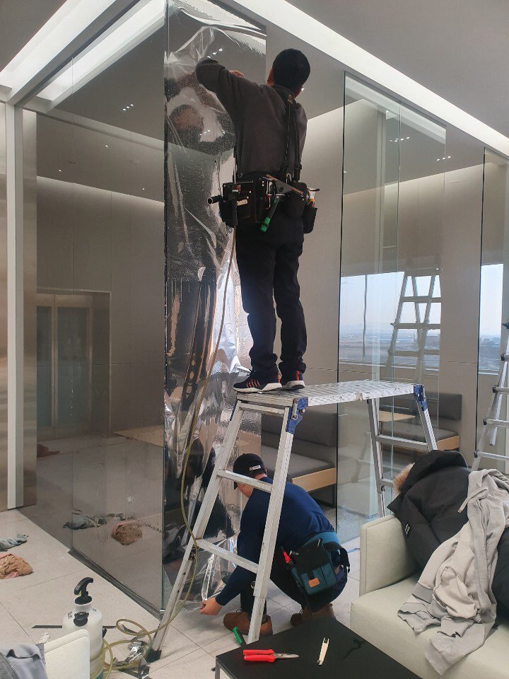 시공중 - TSS20필름[외부시선차단]필름으로 작업중입니다. 작업 중인데 벌써 밖에서 안이 보이지 않는걸로 보입니다.