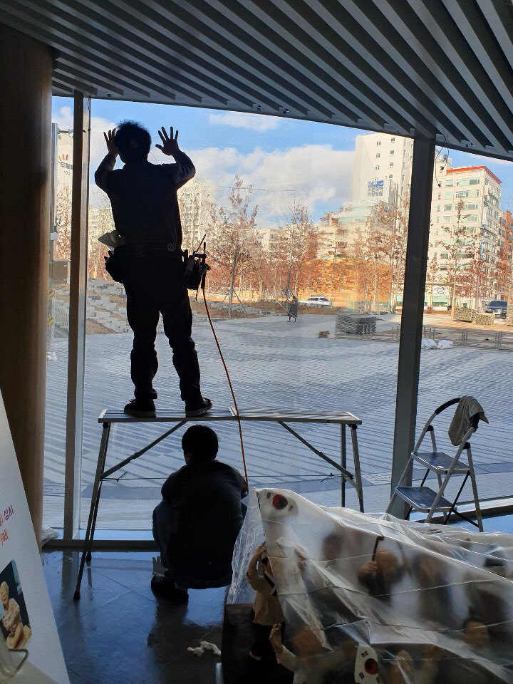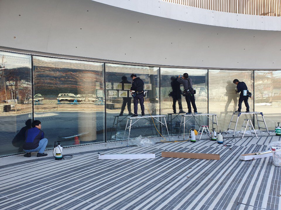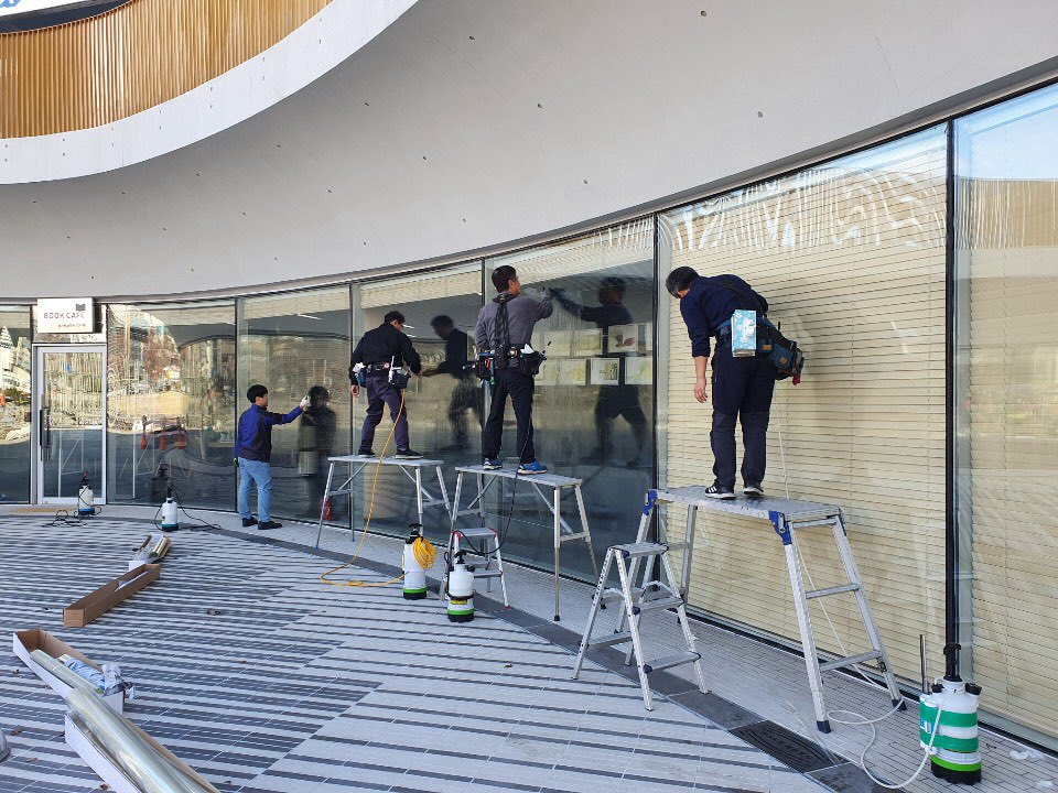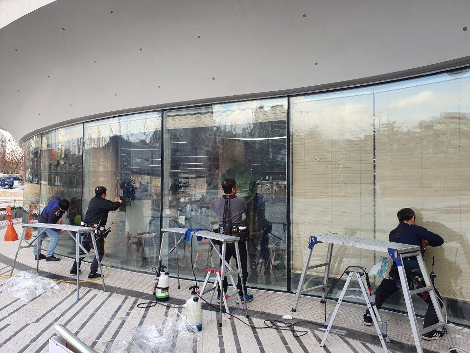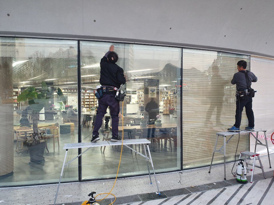 시공 중 - 외부와 내부의 안전/방범필름 으로 부착을 시작하였습니다.