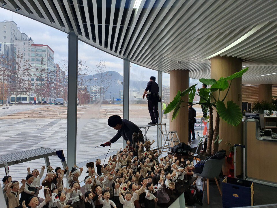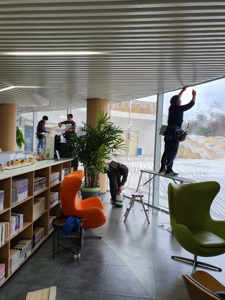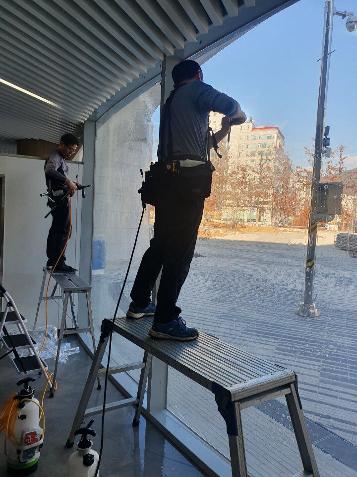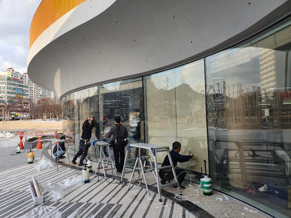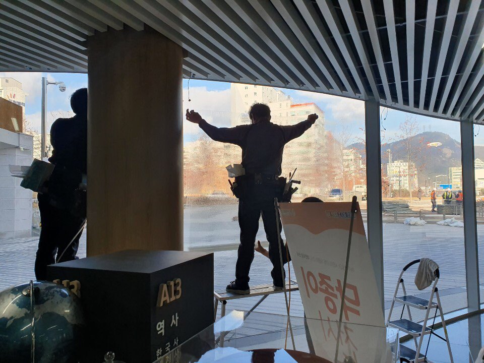 시공 중 - 외부와 내부의 안전/방범필름 으로 부착을 시작하였습니다.