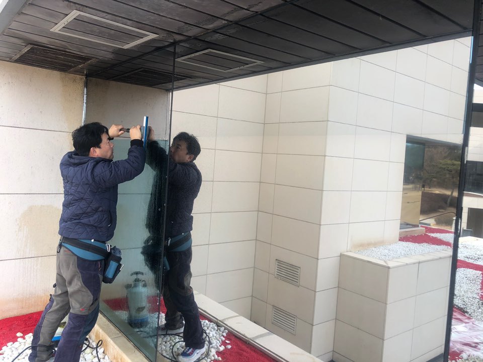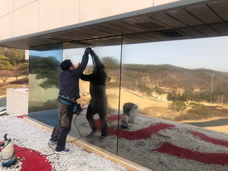 본드제거 작업을 완료한 후 본격적인 외부용시선차단필름 부착 시공을 시작하였습니다.
