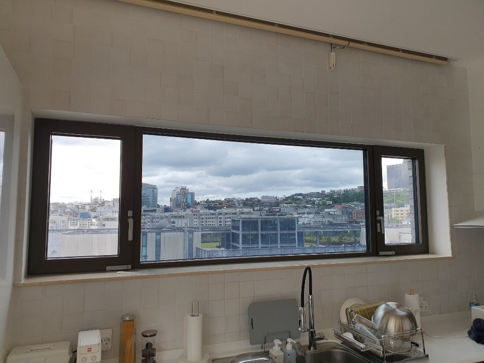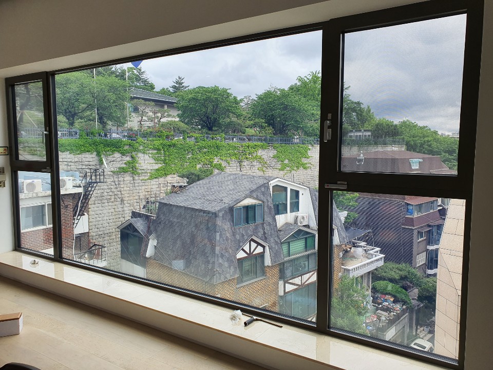 채광이 상당히 좋은 주택의 거실 통창과 주방쪽 창에 TSER(총열차단율)이 좋고 고급스러운 칼라를 자랑하는 아쿠아 제품으로 시공하였습니다.